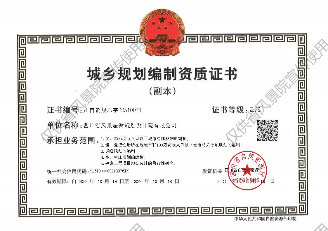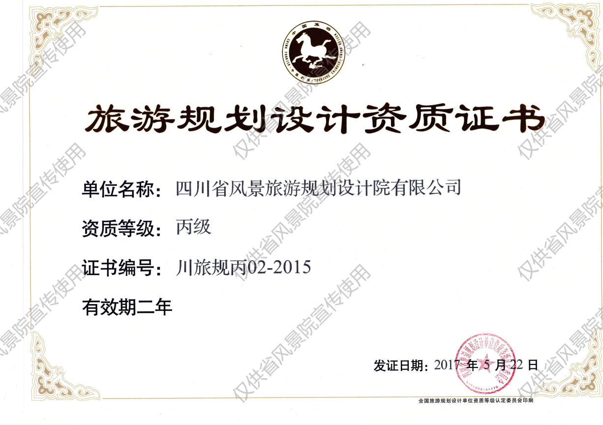 四川省风景旅游规划设计院,简称“四川省风景院”(SCPD),是从事风景园林(Landscape Architecture)、文化旅游(Cultural&Tourism Strategy)、城乡规划(Urban&RuralPlanning)、创意设计(Creative Design)的专业咨询服务机构,具有城乡规划和旅游规划双资质,是1S09001质量管理体系认证企业。