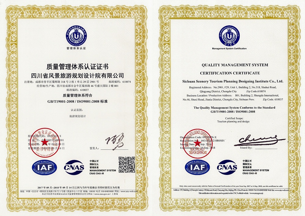 2016年9月22日,在接受了前期全面深入的初审、复审过后,四川省风景旅游规划设计院成功获得ISO9001质量管理体系认证证书。